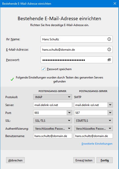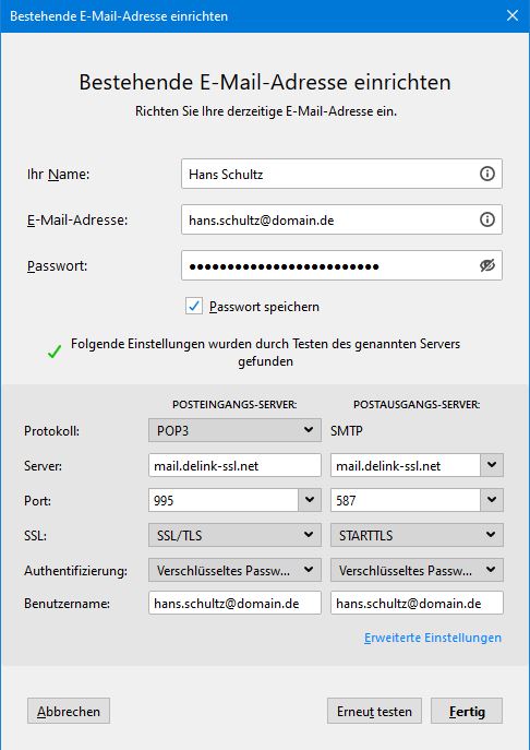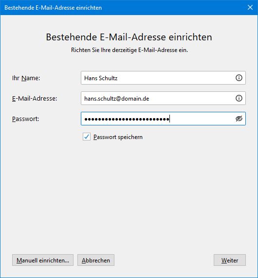 Im Dialog Bestehende E-Mail-Adresse einrichten tragen Sie Ihren eigenen Namen, Ihre E-Mail-Adresse und Ihr Passwort ein. (Im Beispiel wird die Einrichtung eines E-Mail-Accounts für Hans Schultz mit der Adresse hans.schultz@domain.de gezeigt.) Klicken Sie auf Weiter.