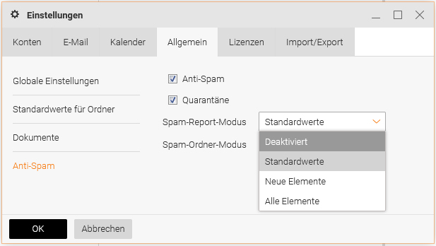 Sie möchten keine Spam Reports bekommen? Kein Problem - Sie können für jeden Ihrer E-Mailaccounts einstellen, ob und wie Sie die Reports bekommen wollen. Um die Reports zu deaktivieren, melden Sie sich mit Webmail an, gehen Sie auf Einstellungen und stellen im Tab Allgemein den Spam-Report-Modus um: