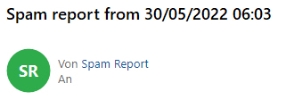 Für alle E-Mailkonten bei naymspace systems ist seit 2022 standardmäßig eingestellt, dass für eingehende Mails, die das System als Spam klassifiziert hat, ein Spam Report erstellt und per Mail zugestellt wird. (Falls keine solchen Mails eingegangen sind, wird auch kein Spam Report generiert.) Der Inhalt des Report kann zum Beispiel wie folgt aussehen: