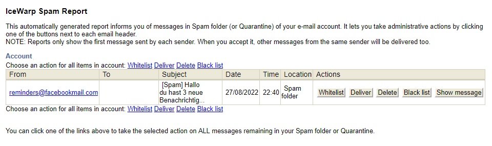 Woran erkennen Sie, dass der Spam Report (Whitelist / Deliver / Delete / Black list / Show message) echt ist und tatsächlich von naymspace systems kommt? Darauf zu achten, ist WICHTIG - es werden viele Phishing-Mails mit angeblichen Spamreports verschickt. Wenn man auf einen Link in einer solchen gefälschten Mail klickt, besteht ein erhebliches Risiko, sich mit Malware zu infizieren!