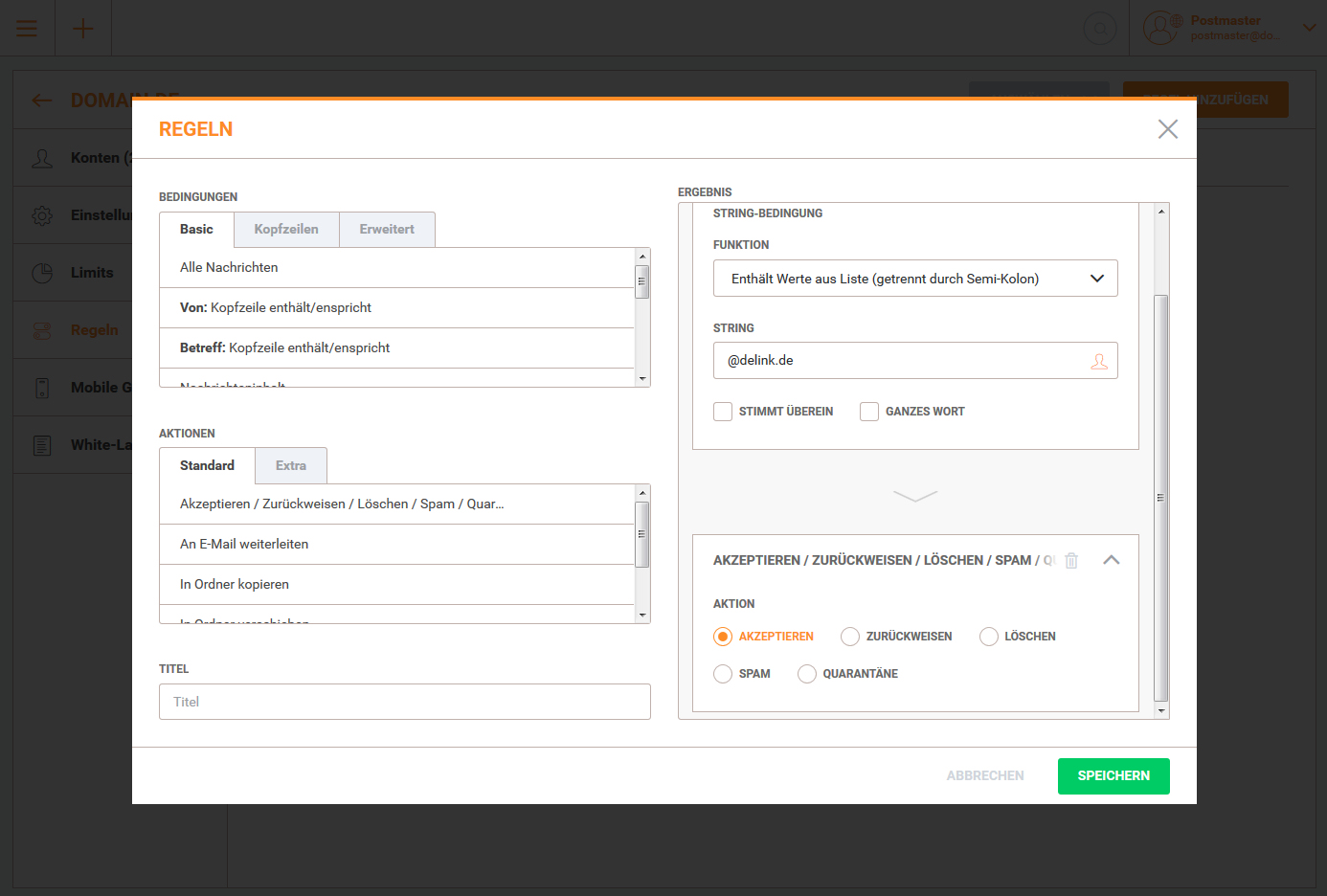 ein. Ersetzen Sie dabei <absenderdomain> und gegebenenfalls <account> durch die Domain und den Account, von deren Adressen Sie Mails ohne weitere Spamprüfung erhalten wollen. Um Mails von allen Emailadressen @delink.de zu erhalten, tragen Sie die Werte wie im folgenden Beispiel ein. Es ist sinnvoll, unter TITEL eine – von Ihnen frei wählbare – Beschreibung einzugeben, damit Sie die Regel später leicht identifizieren können.