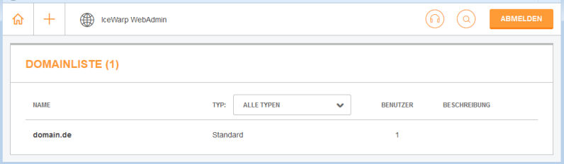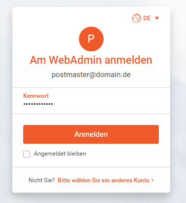 Geben Sie den Namen und das Passwort an, das Sie von uns erhalten haben. Beachten Sie bitte, dass sich nur Benutzer mit Administratorrechten an der WebAdmin-Oberfläche anmelden können. Das ist standardmäßig der Benutzer postmaster@domain.de. Die Übersichtsseite für die Verwaltung Ihres Mailservers wird angezeigt.