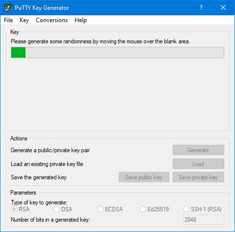Die gezeigten Voreinstellungen sind bereits in Ordnung - es soll ein Key vom Typ RSA mit mindestens 2048 bit Länge erzeugt werden. Weniger als 2048 bit sollten es nicht sein! Klicken Sie auf Generate und bewegen Sie anschließend den Mauszeiger über dem leeren Bereich des Fensters möglichst willkürlich hin und her. Das ist wichtig, um zufällige Werte zum Erzeugen des Schlüssels bereitzustellen.
