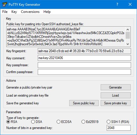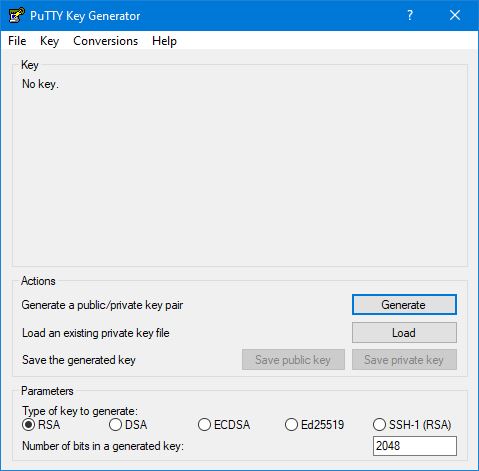 Für ein sicheres Login per SSH auf einem Server oder auch für die Verwendung einer Key-Authentifizierung für SFTP brauchen Sie ein Schlüsselpaar, bestehend aus einem öffentlichen und einem privaten Schlüssel. Ein Schlüsselpaar können Sie einfach und mit kostenlosen Tools wie zum Beispiel openSSL oder PuTTYgen erstellen. PuTTYgen ist Bestandteil des PuTTY-Pakets. Hier beschreiben wir, wie man ein Schlüsselpaar mit PuTTYgen erzeugt. Starten Sie PuTTYgen. Es erscheint ein Fenster: